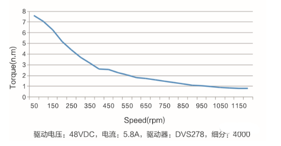 步進電機和伺服電機不同,他的力矩輸出不是恒定的,隨著轉速的升高力矩會下降,所以步進沒有額定力矩的說法,只有靜力矩參數,就是電機激磁,速度接近0時的力矩就是步進電機的最大力矩。所以步進電機的選型不得不考慮他的力矩速度特性曲線,下圖是米格兩項8牛米步進電機的力矩速度特性曲線圖。