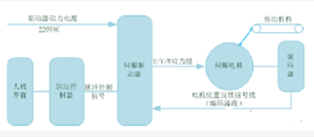 伺服控制過程,如上圖。操作者通過人機界面(觸摸屏、PC、液晶屏等)將數據設定到運動控制器。在由運動控制器將伺服控制信號(位置、速度、方向、軌跡等信息)傳遞到伺服驅動器,驅動器將控制信號轉化到電機的位置、速度、方向、軌跡,繼而拖動傳動機構實現機構的運動控制。伺服電機編碼器將自身旋轉過的實際位置反饋到伺服驅動器,進行實時的位置糾偏控制,以達到精準位置控制。