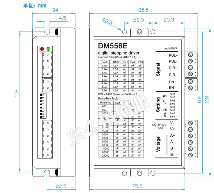 型號:DM556E 名稱:DM556E兩相步進驅動器驅動57、86電機 簡介: