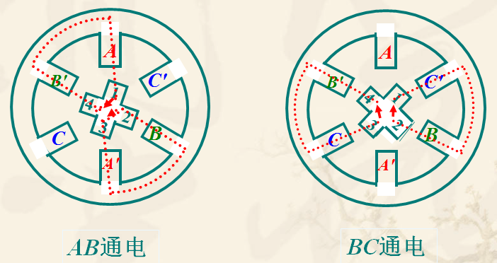 B相通電,轉子2、4齒和B相軸線對齊,相對A相通電位置轉30°;