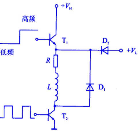 開始時(shí)T1T2同時(shí)導(dǎo)通, VH供電,i迅速上升VH很快關(guān)斷,VL繼續(xù)供電。