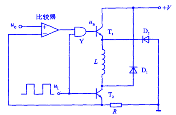 由于繞組電感的作用,R上的電壓逐漸升高,當(dāng)超過給定電壓uc時(shí),比較器輸出低電平®與門輸出低電平® T1截止®電源被切斷;當(dāng)取樣電阻上的電壓小于uc時(shí),比較器輸出高電平,與門也輸出高電平,T1又導(dǎo)通,電源又開始向繞組供電。